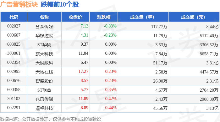 从资金流向上来看,当日广告营销板块主力资金净流入3.89亿元,游资资金净流入2.84亿元,散户资金净流出6.73亿元。广告营销板块个股资金流向见下表: