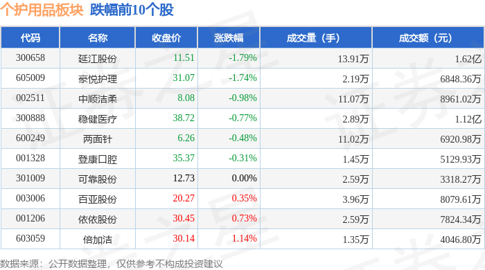 证券之星消息,12月8日个护用品板块较上一交易日下跌0.38%,延江股份领跌。当日上证指数报收于3924.08,上涨0.54%。深证成指报收于13329.99,上涨1.39%。个护用品板块个股涨跌见下表: