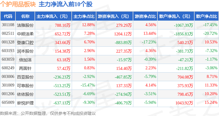 从资金流向上来看,当日个护用品板块主力资金净流出1669.64万元,游资资金净流入1187.6万元,散户资金净流入482.05万元。个护用品板块个股资金流向见下表: