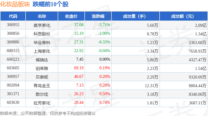 证券之星消息,12月8日化妆品板块较上一交易日上涨0.38%,锦盛新材领涨。当日上证指数报收于3924.08,上涨0.54%。深证成指报收于13329.99,上涨1.39%。化妆品板块个股涨跌见下表: