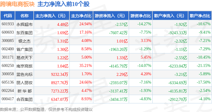 从资金流向上来看,当日跨境电商板块主力资金净流入8.0亿元,游资资金净流入9254.07万元,散户资金净流出8.92亿元。跨境电商板块个股资金流向见下表: