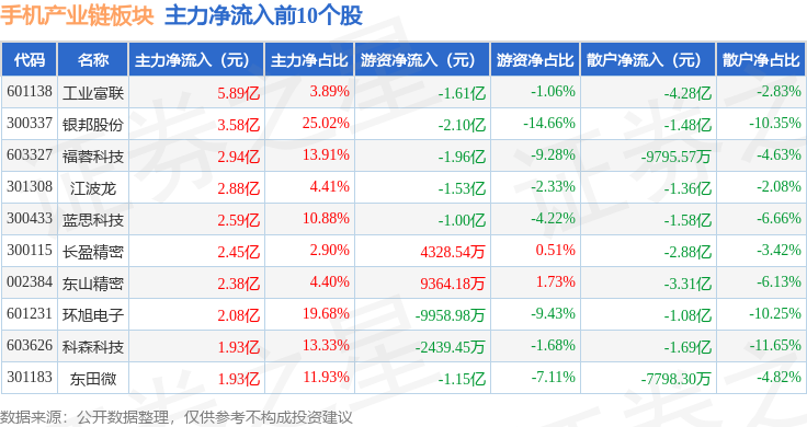 从资金流向上来看,当日手机产业链板块主力资金净流入9.96亿元,游资资金净流出10.19亿元,散户资金净流入2306.11万元。手机产业链板块个股资金流向见下表: