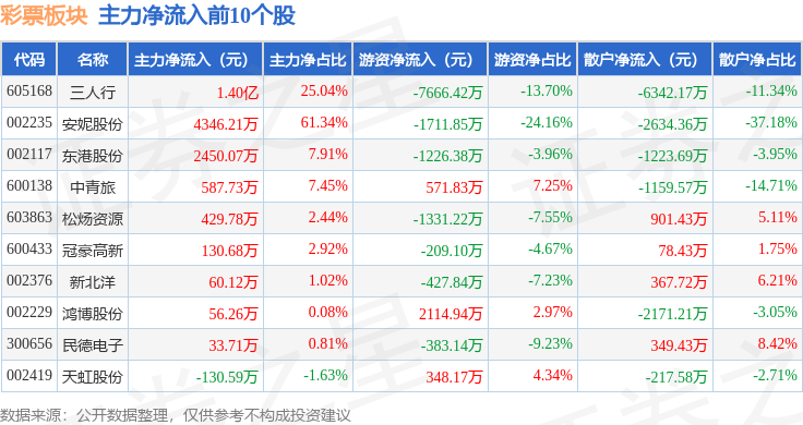 从资金流向上来看,当日彩票板块主力资金净流入8111.54万元,游资资金净流出5280.9万元,散户资金净流出2830.63万元。彩票板块个股资金流向见下表: