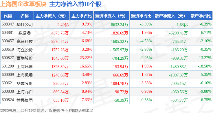 从资金流向上来看,当日上海国企改革板块主力资金净流出5.85亿元,游资资金净流入1.66亿元,散户资金净流入4.2亿元。上海国企改革板块个股资金流向见下表:
