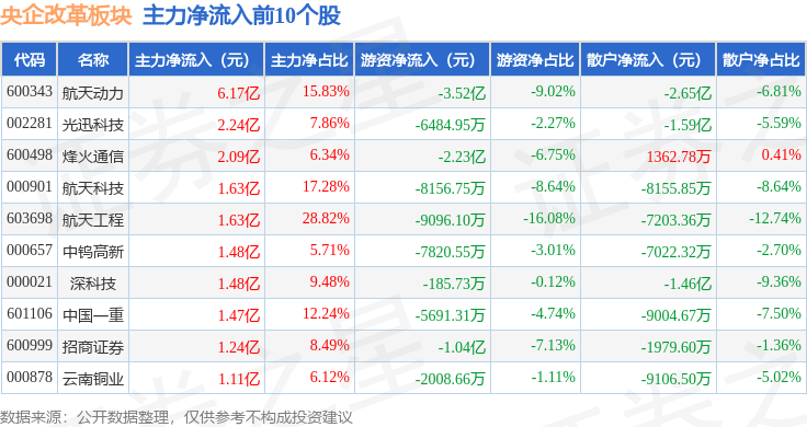 从资金流向上来看,当日央企改革板块主力资金净流出54.41亿元,游资资金净流入5.86亿元,散户资金净流入48.55亿元。央企改革板块个股资金流向见下表: