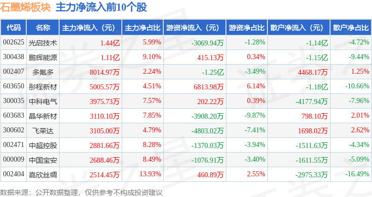 从资金流向上来看,当日石墨烯板块主力资金净流出3.01亿元,游资资金净流出2.16亿元,散户资金净流入5.17亿元。石墨烯板块个股资金流向见下表: