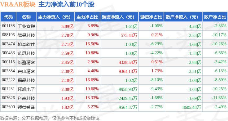 从资金流向上来看,当日VR&AR板块主力资金净流入2461.7万元,游资资金净流入1.21亿元,散户资金净流出1.46亿元。VR&AR板块个股资金流向见下表: