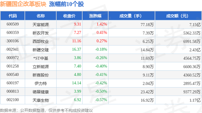 从资金流向上来看,当日新疆国企改革板块主力资金净流出1.05亿元,游资资金净流入4937.69万元,散户资金净流入5599.64万元。新疆国企改革板块个股资金流向见下表: