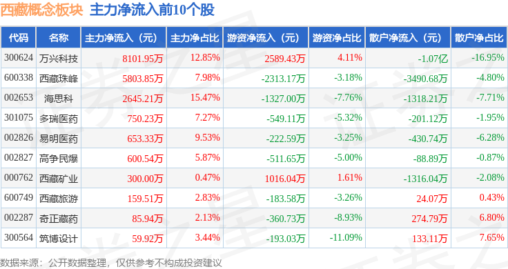 从资金流向上来看,当日西藏概念板块主力资金净流出9518.29万元,游资资金净流入1.14亿元,散户资金净流出1925.92万元。西藏概念板块个股资金流向见下表: