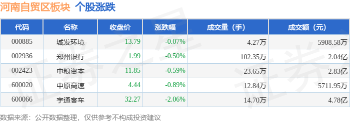 证券之星消息,12月8日河南自贸区板块较上一交易日下跌1.37%,宇通客车领跌。当日上证指数报收于3924.08,上涨0.54%。深证成指报收于13329.99,上涨1.39%。河南自贸区板块个股涨跌见下表: