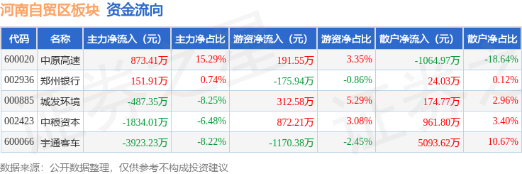 从资金流向上来看,当日河南自贸区板块主力资金净流出5219.28万元,游资资金净流入30.03万元,散户资金净流入5189.25万元。河南自贸区板块个股资金流向见下表: