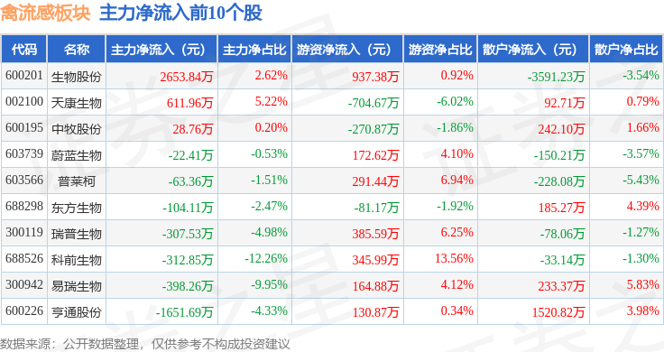 从资金流向上来看,当日禽流感板块主力资金净流出1862.92万元,游资资金净流入3030.47万元,散户资金净流出1167.55万元。禽流感板块个股资金流向见下表: