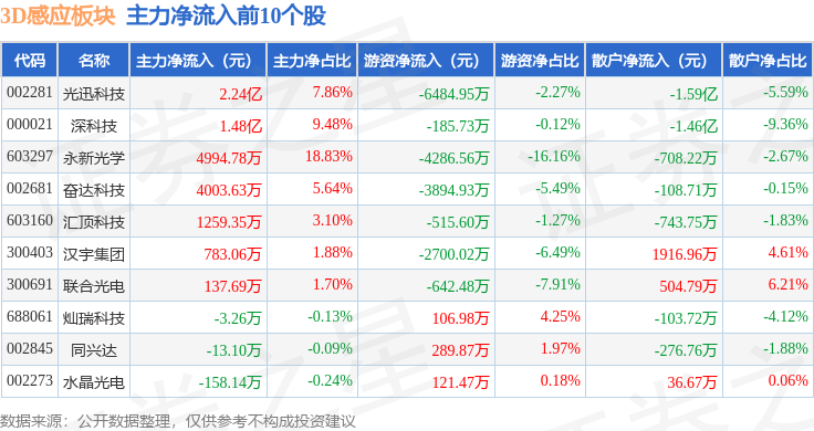 从资金流向上来看,当日3D感应板块主力资金净流出8.93亿元,游资资金净流出3280.77万元,散户资金净流入9.26亿元。3D感应板块个股资金流向见下表: