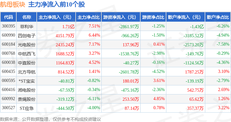 从资金流向上来看,当日航母板块主力资金净流出5.19亿元,游资资金净流出1.69亿元,散户资金净流入6.88亿元。航母板块个股资金流向见下表: