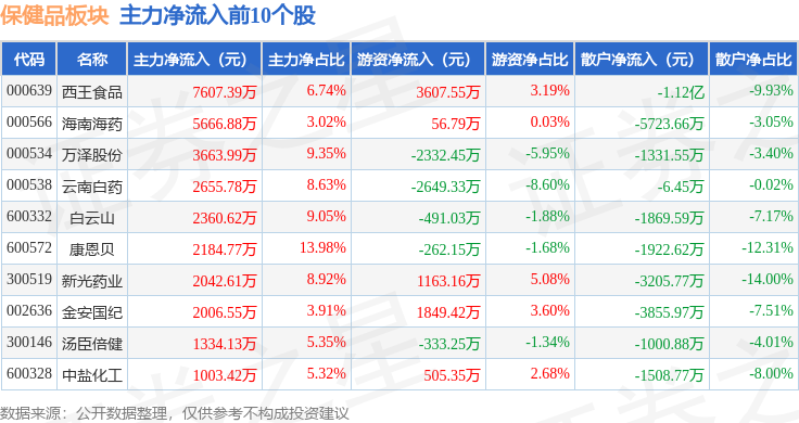 从资金流向上来看,当日保健品板块主力资金净流出3.51亿元,游资资金净流入3.08亿元,散户资金净流入4298.78万元。保健品板块个股资金流向见下表: