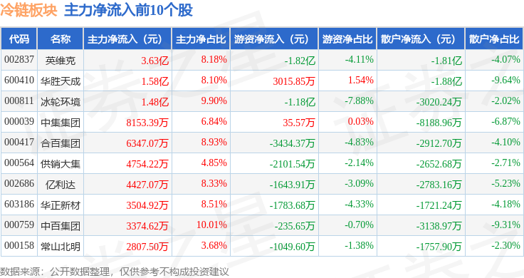 从资金流向上来看,当日冷链板块主力资金净流入6608.61万元,游资资金净流出1.14亿元,散户资金净流入4814.08万元。冷链板块个股资金流向见下表: