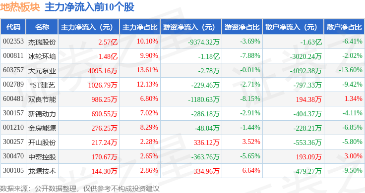 从资金流向上来看,当日地热板块主力资金净流入7851.03万元,游资资金净流出1.76亿元,散户资金净流入9721.64万元。地热板块个股资金流向见下表: