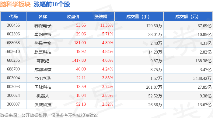 证券之星消息,12月8日脑科学板块较上一交易日上涨2.84%,赛微电子领涨。当日上证指数报收于3924.08,上涨0.54%。深证成指报收于13329.99,上涨1.39%。脑科学板块个股涨跌见下表: