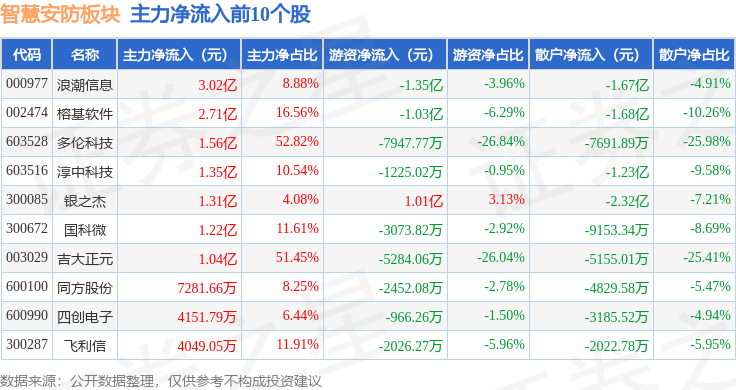 从资金流向上来看,当日智慧安防板块主力资金净流出1.3亿元,游资资金净流出3.17亿元,散户资金净流入4.47亿元。智慧安防板块个股资金流向见下表: