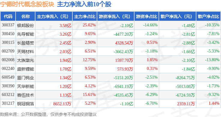 从资金流向上来看,当日宁德时代概念股板块主力资金净流入20.53亿元,游资资金净流出7.42亿元,散户资金净流出13.11亿元。宁德时代概念股板块个股资金流向见下表: