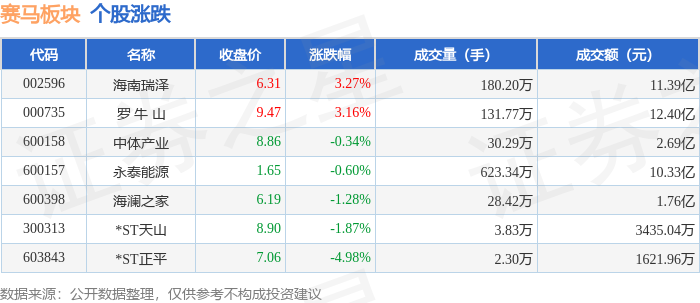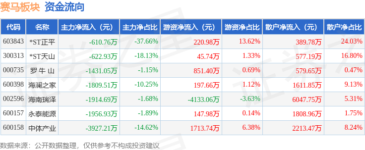 从资金流向上来看,当日赛马板块主力资金净流出1.23亿元,游资资金净流出955.57万元,散户资金净流入1.32亿元。赛马板块个股资金流向见下表: