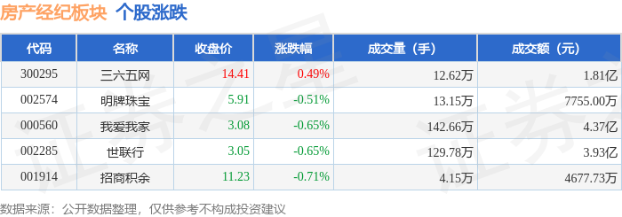 证券之星消息,12月8日房产经纪板块较上一交易日下跌0.81%,招商积余领跌。当日上证指数报收于3924.08,上涨0.54%。深证成指报收于13329.99,上涨1.39%。房产经纪板块个股涨跌见下表: