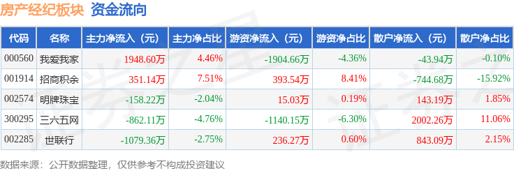 从资金流向上来看,当日房产经纪板块主力资金净流入200.04万元,游资资金净流出2399.97万元,散户资金净流入2199.93万元。房产经纪板块个股资金流向见下表: