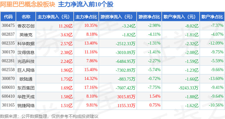 从资金流向上来看,当日阿里巴巴概念股板块主力资金净流入35.16亿元,游资资金净流出4.64亿元,散户资金净流出30.52亿元。阿里巴巴概念股板块个股资金流向见下表: