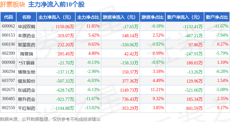 从资金流向上来看,当日肝素板块主力资金净流出3.01亿元,游资资金净流入1.56亿元,散户资金净流入1.45亿元。肝素板块个股资金流向见下表: