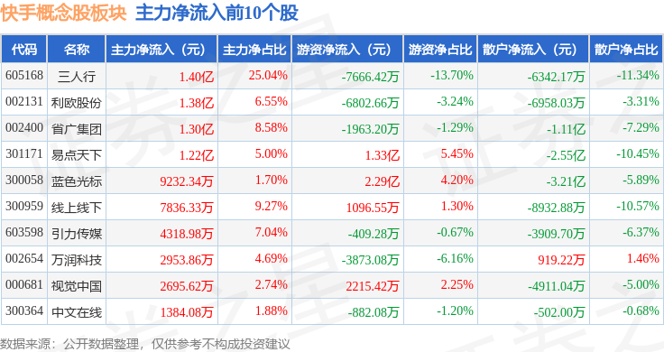 从资金流向上来看,当日快手概念股板块主力资金净流入5.95亿元,游资资金净流入1.75亿元,散户资金净流出7.7亿元。快手概念股板块个股资金流向见下表: