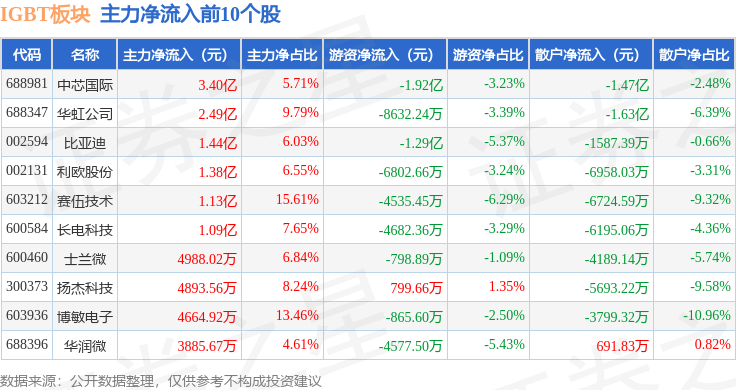 从资金流向上来看,当日IGBT板块主力资金净流入11.25亿元,游资资金净流出5.36亿元,散户资金净流出5.89亿元。IGBT板块个股资金流向见下表: