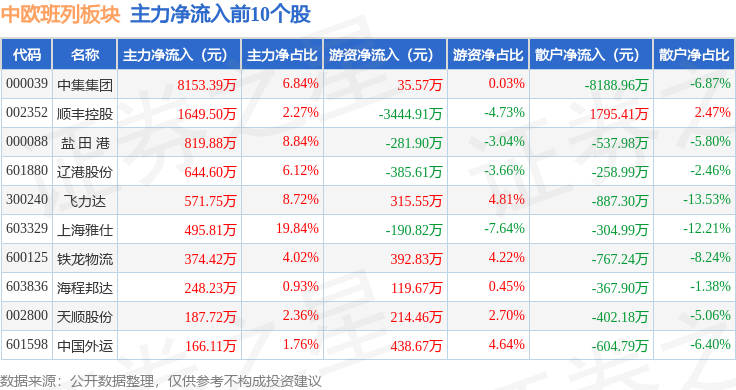 从资金流向上来看,当日中欧班列板块主力资金净流出1.49亿元,游资资金净流入3505.11万元,散户资金净流入1.14亿元。中欧班列板块个股资金流向见下表:
