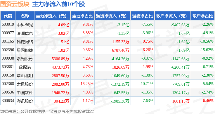 从资金流向上来看,当日国资云板块主力资金净流入3.03亿元,游资资金净流出3.47亿元,散户资金净流入4311.06万元。国资云板块个股资金流向见下表: