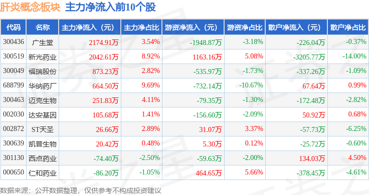 从资金流向上来看,当日肝炎概念板块主力资金净流出2.31亿元,游资资金净流入9415.15万元,散户资金净流入1.37亿元。肝炎概念板块个股资金流向见下表:
