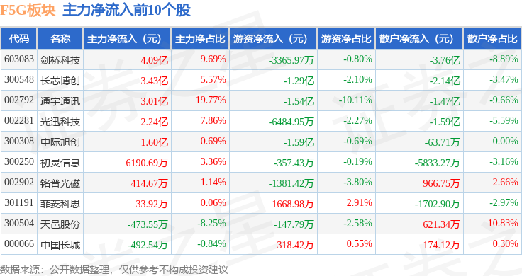 从资金流向上来看,当日F5G板块主力资金净流入14.21亿元,游资资金净流出5.23亿元,散户资金净流出8.98亿元。F5G板块个股资金流向见下表: