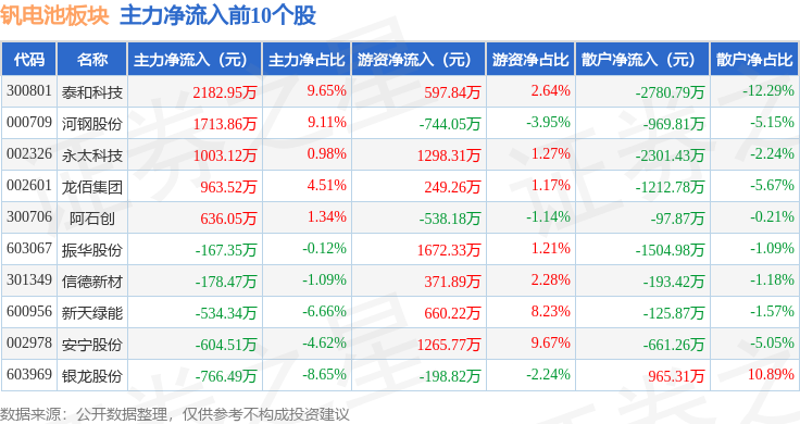 从资金流向上来看,当日钒电池板块主力资金净流出2.56亿元,游资资金净流入1.14亿元,散户资金净流入1.42亿元。钒电池板块个股资金流向见下表:
