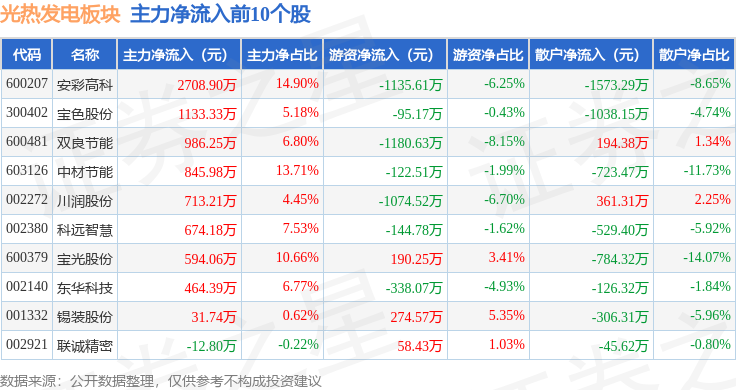 从资金流向上来看,当日光热发电板块主力资金净流出1.68亿元,游资资金净流出4884.48万元,散户资金净流入2.17亿元。光热发电板块个股资金流向见下表: