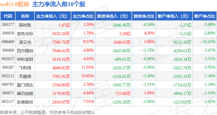 从资金流向上来看,当日web3.0板块主力资金净流入3.84亿元,游资资金净流入1.57亿元,散户资金净流出5.41亿元。web3.0板块个股资金流向见下表:
