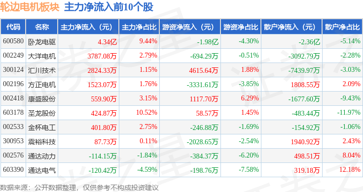 从资金流向上来看,当日轮边电机板块主力资金净流入4.19亿元,游资资金净流出1.74亿元,散户资金净流出2.44亿元。轮边电机板块个股资金流向见下表: