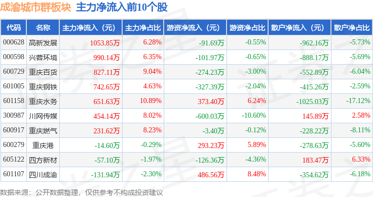 从资金流向上来看,当日成渝城市群板块主力资金净流出1.6亿元,游资资金净流入9614.56万元,散户资金净流入6370.03万元。成渝城市群板块个股资金流向见下表: