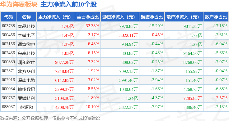 从资金流向上来看,当日华为海思板块主力资金净流入2.81亿元,游资资金净流出3.52亿元,散户资金净流入7120.08万元。华为海思板块个股资金流向见下表: