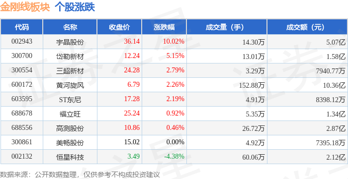 证券之星消息,12月8日金刚线板块较上一交易日上涨1.65%,宇晶股份领涨。当日上证指数报收于3924.08,上涨0.54%。深证成指报收于13329.99,上涨1.39%。金刚线板块个股涨跌见下表: