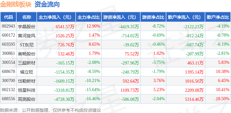 从资金流向上来看,当日金刚线板块主力资金净流出2048.79万元,游资资金净流出4519.31万元,散户资金净流入6568.11万元。金刚线板块个股资金流向见下表: