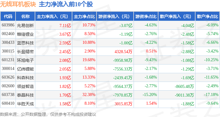 从资金流向上来看,当日无线耳机板块主力资金净流入28.83亿元,游资资金净流出11.6亿元,散户资金净流出17.23亿元。无线耳机板块个股资金流向见下表: