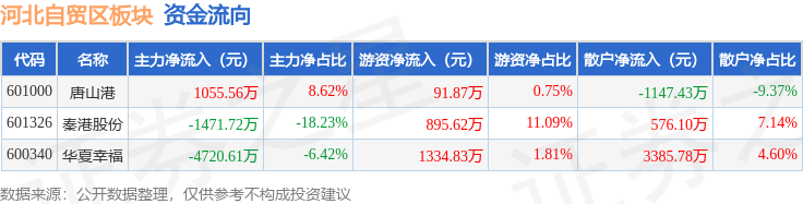 从资金流向上来看,当日河北自贸区板块主力资金净流出5136.77万元,游资资金净流入2322.32万元,散户资金净流入2814.45万元。河北自贸区板块个股资金流向见下表:
