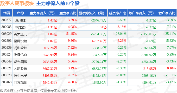 从资金流向上来看,当日数字人民币板块主力资金净流入4.76亿元,游资资金净流出1.88亿元,散户资金净流出2.88亿元。数字人民币板块个股资金流向见下表: