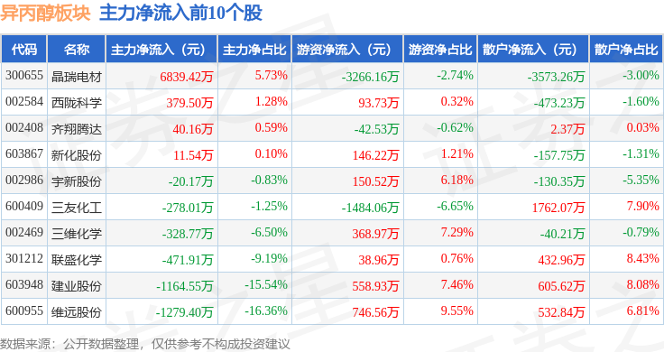 从资金流向上来看,当日异丙醇板块主力资金净流出5139.47万元,游资资金净流出1994.75万元,散户资金净流入7134.22万元。异丙醇板块个股资金流向见下表: