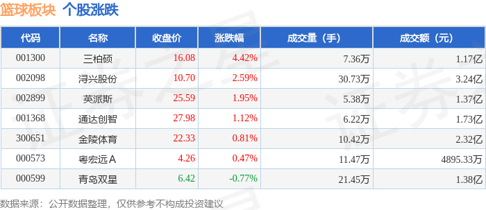 证券之星消息,12月8日篮球板块较上一交易日上涨1.51%,三柏硕领涨。当日上证指数报收于3924.08,上涨0.54%。深证成指报收于13329.99,上涨1.39%。篮球板块个股涨跌见下表: