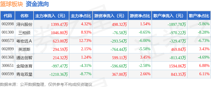 从资金流向上来看,当日篮球板块主力资金净流入1370.36万元,游资资金净流出266.72万元,散户资金净流出1103.63万元。篮球板块个股资金流向见下表: