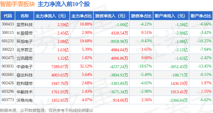 从资金流向上来看,当日智能手表板块主力资金净流入3213.1万元,游资资金净流入1345.39万元,散户资金净流出4558.5万元。智能手表板块个股资金流向见下表: